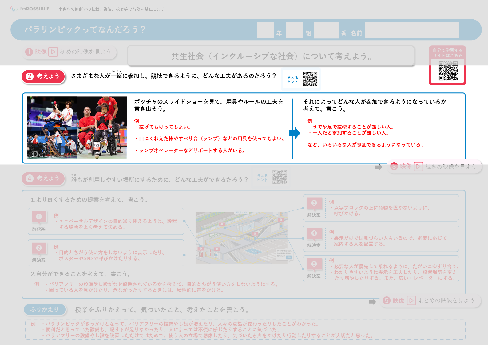 共生社会(インクルーシブな社会)をつくるために、誰もが機会を損なわないよう、自分なりに考え、行動することの大切さを理解します。