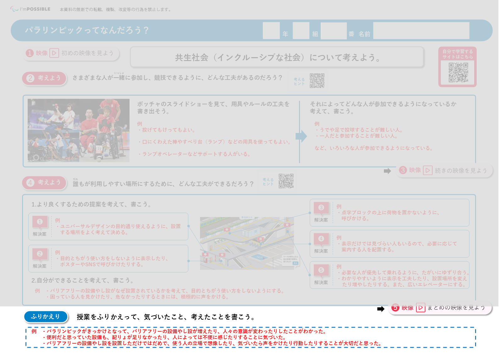 共生社会(インクルーシブな社会)をつくるために、誰もが機会を損なわないよう、自分なりに考え、行動することの大切さを理解します。